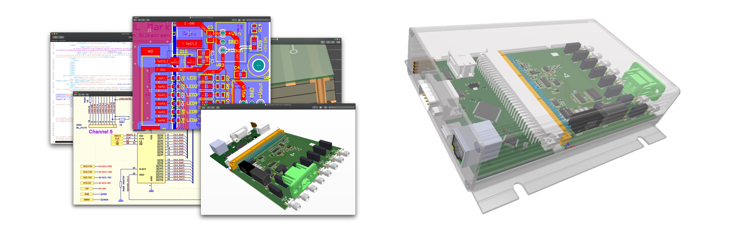 Für das Design mechanischer Komponenten und Gehäuse, die für die Elektronik benötigt werden, setzen wir auf Programme wie AutoCAD, SolidWorks und Design-Spark. Die daraus erstellten 3D-Modelle werden auch dazu benutzt, um die entwickelte Elektronik mit den mechanischen Komponenten zusammenzuführen (3D-Integration).