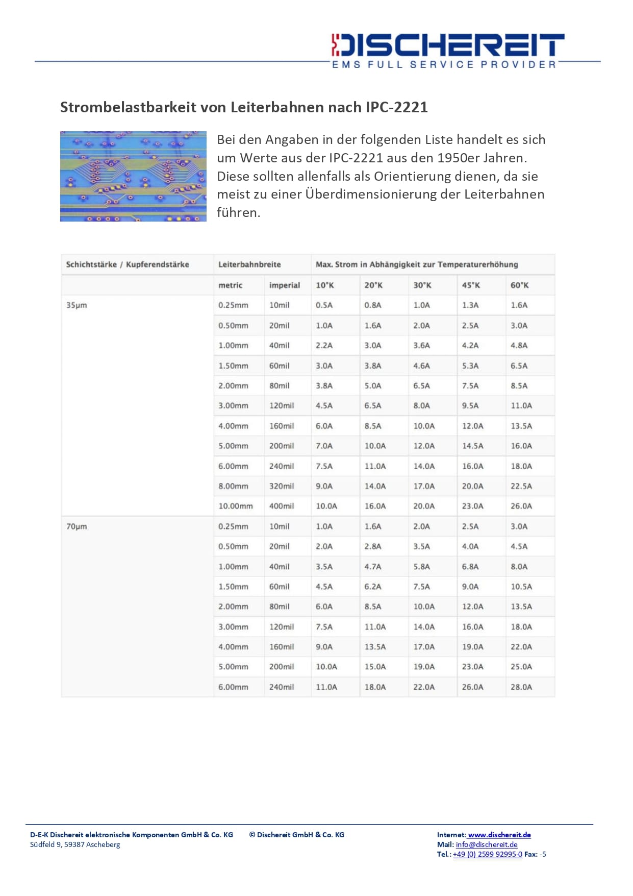 Eine Design-Richtlinie zur Strombelastbarkeit von Leiterbahnen wurde erstmals in den späten 1950er Jahren vom National Bureau of Standards herausgegeben. Die Angaben aus dieser IPC-2221 beziehen sich auf eine geradlinige Leiterbahn auf einer doppelseitigen Leiterplatte. Die gegenüberliegende Seite dieser Leiterbahn in komplett mit einer Kupferfläche bedeckt. Nahezu alle Listen zu Querschnitten einer Leiterbahn und deren Strombelastbarkeiten, die im Internet kursieren, beziehen sich eben auf diese Richtlinie. Die Anwendung dieser Vorgaben führt meist zu einer sehr konservativen Auslegung der Leiterbahnen. Das heißt, Sie brauchen mehr Platz, da Ihre Leiterbahnen überdimensioniert sein könnten.